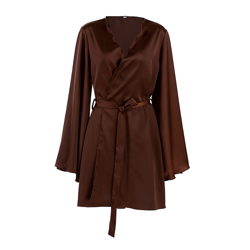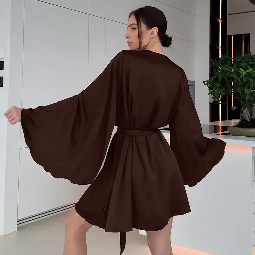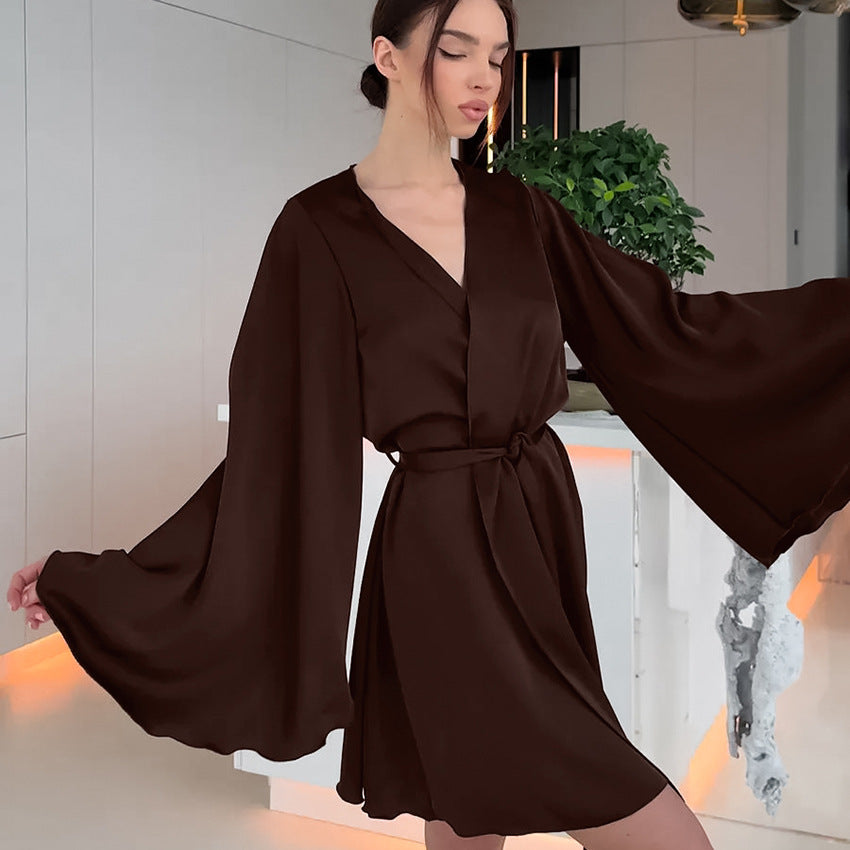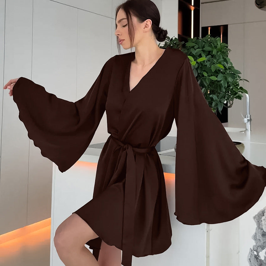 Dieser modische Damen-Bademantel ist die perfekte Wahl für alle, die auch zu Hause nicht auf Stil und Eleganz verzichten möchten. Mit seinem weiten Ärmel-Design und dem edlen Schokobraun kombiniert dieser Morgenmantel zeitlose Ästhetik mit einem unvergleichlich komfortablen Tragegefühl – ideal für entspannte Morgenstunden oder gemütliche Abende.